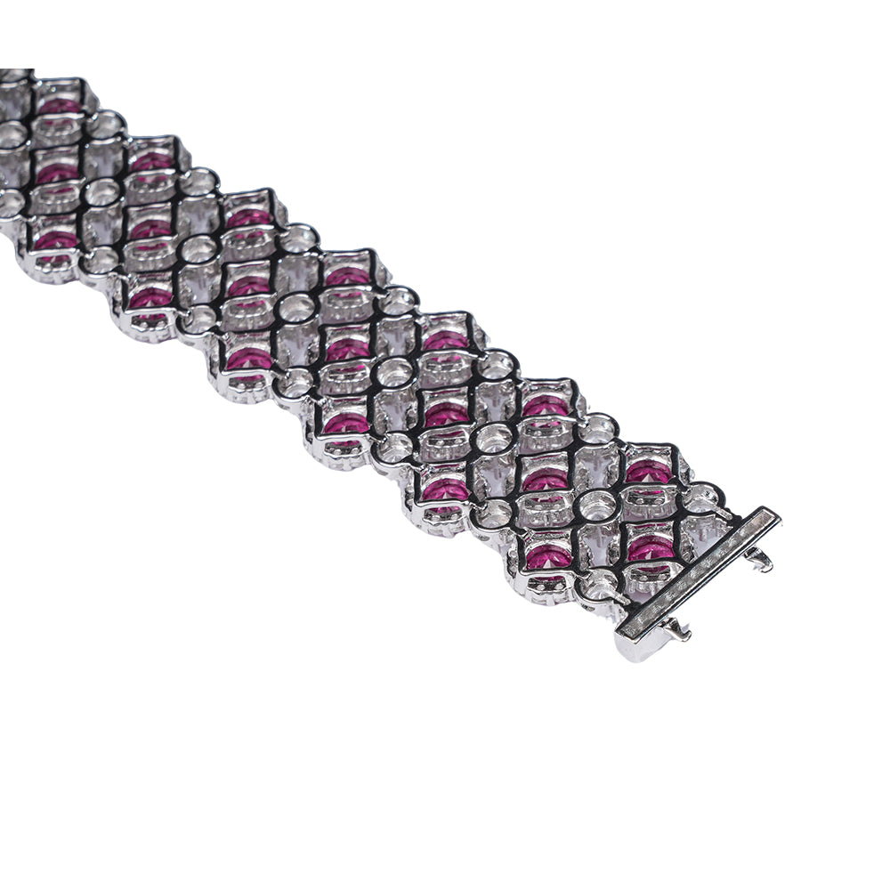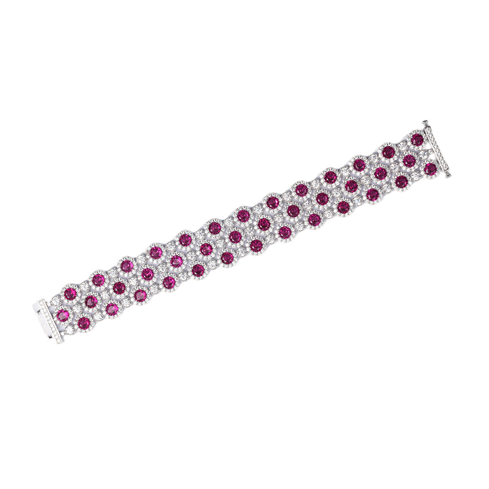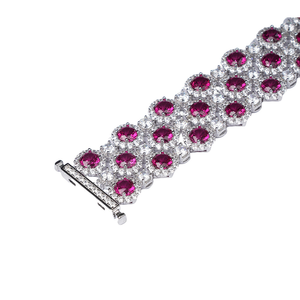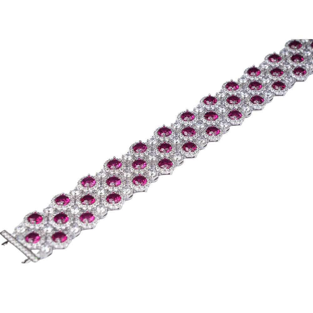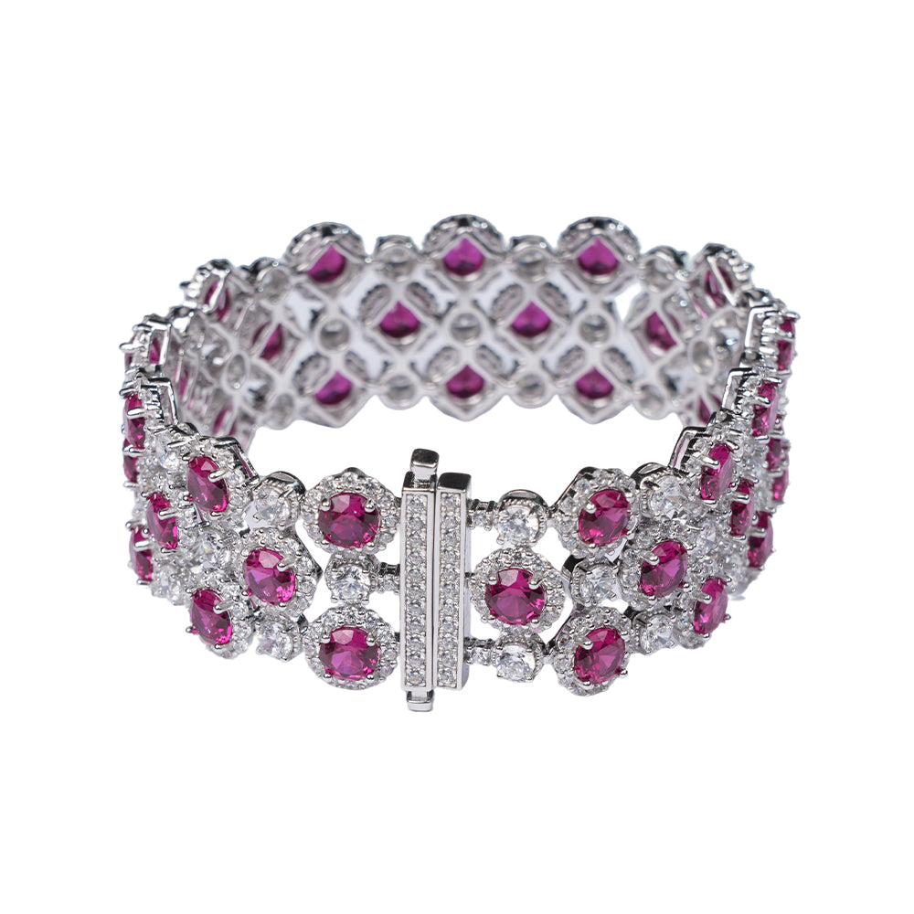 A statement ruby halo bracelet in a triple-row floral layout. Each vivid red lab-created corundum stone is framed by a bright cubic zirconia halo, creating a peony-like bloom that catches light from every angle.