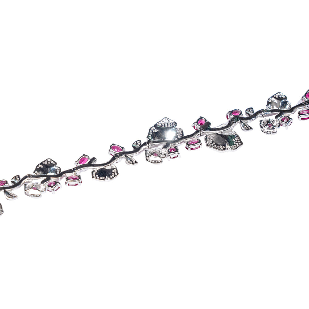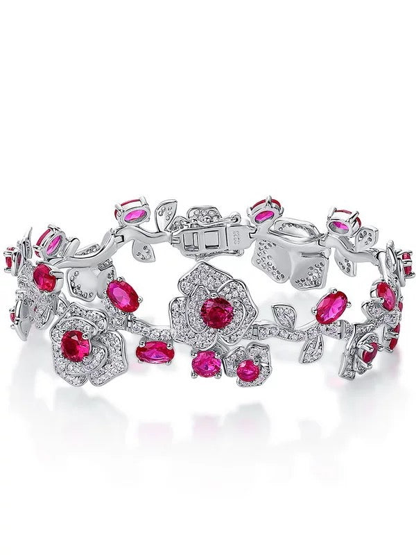 Delicate and romantic, this rose-vine bracelet features vivid red lab-created rubies framed by bright white zircon halos. Each bloom sits on a flowing silver vine, catching light with every movement.