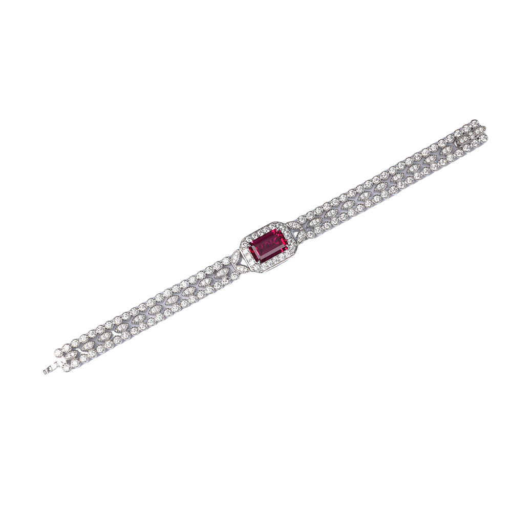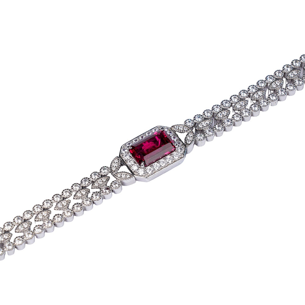 - Emerald‑cut ruby‑colour centre stone with shimmering halo